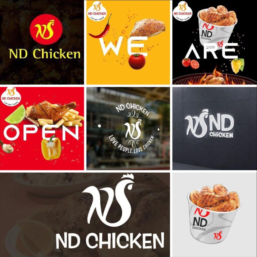 Fusing the initials of the two founding sisters, we crafted a distinctive logo for their chicken-based brand by forming a chicken shape from the letters “N” and “D.” To stand out in a competitive market, we opted for bright red and yellow colors, ensuring the brand would catch attention. This bold branding approach proved successful, helping the brand differentiate itself and attract customers. With its eye-catching logo and vibrant colors, the brand quickly gained traction and became a standout player in the industry.